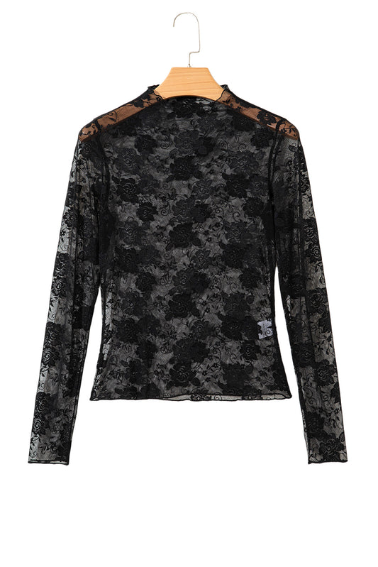 Black Mock Neck Floral Lace Mesh Long Sleeve Top