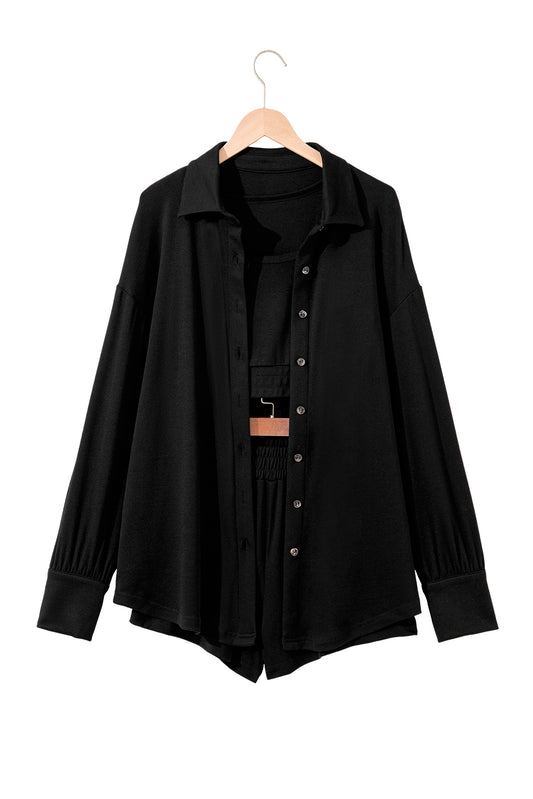 Black Shirred Hem Crop Tank Top Loose Shorts Cardigan 3 Piece Pajama Set