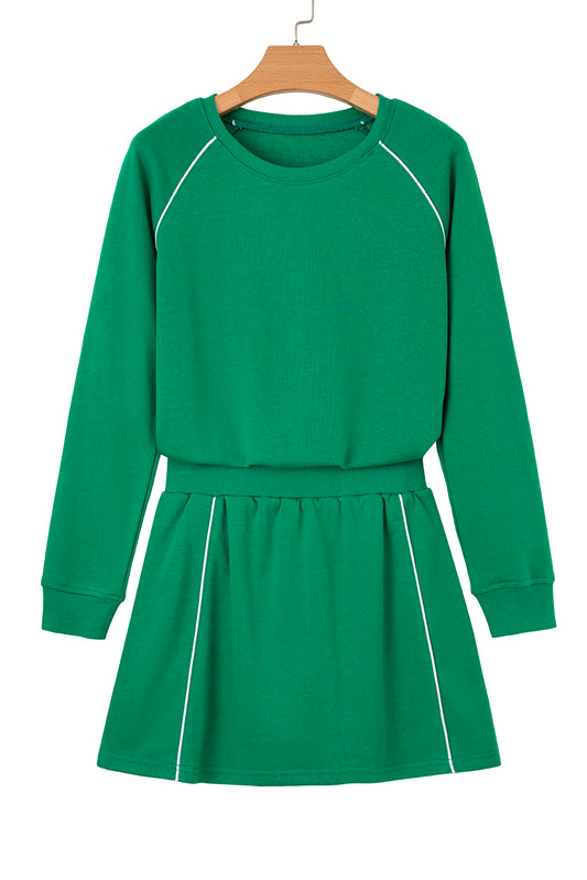 Dark Green Contrast Piping Crewneck Pullover Mini Skirt Set