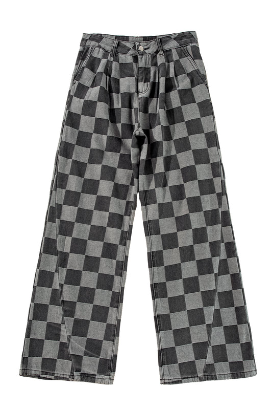 Dark Grey Checkered Light Washed Wide Leg Jeans