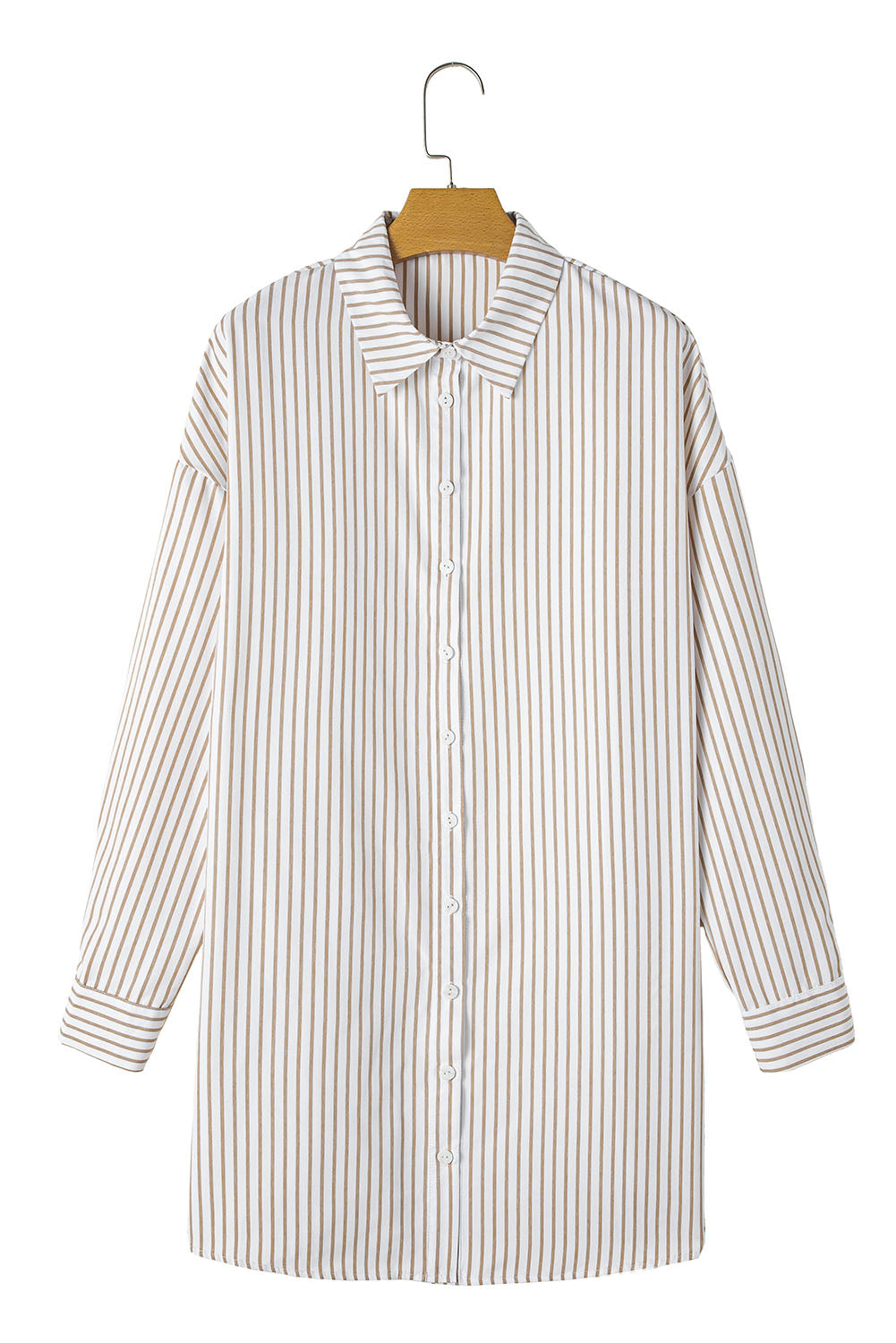Khaki Stripe Long Sleeve Button Up Mini Shirt Dress