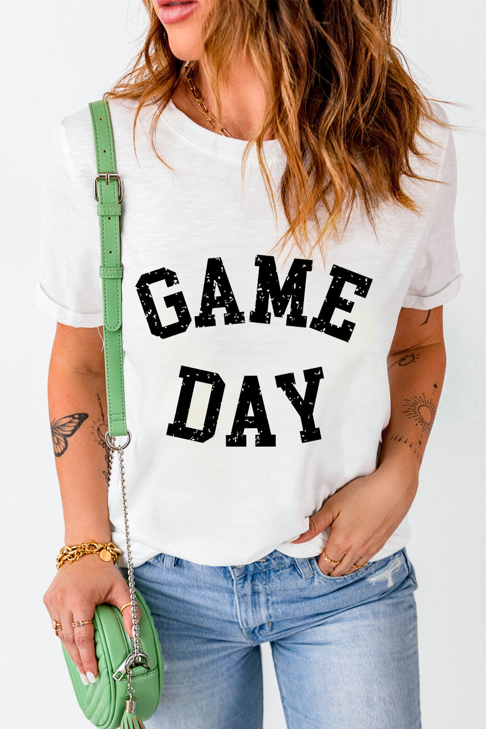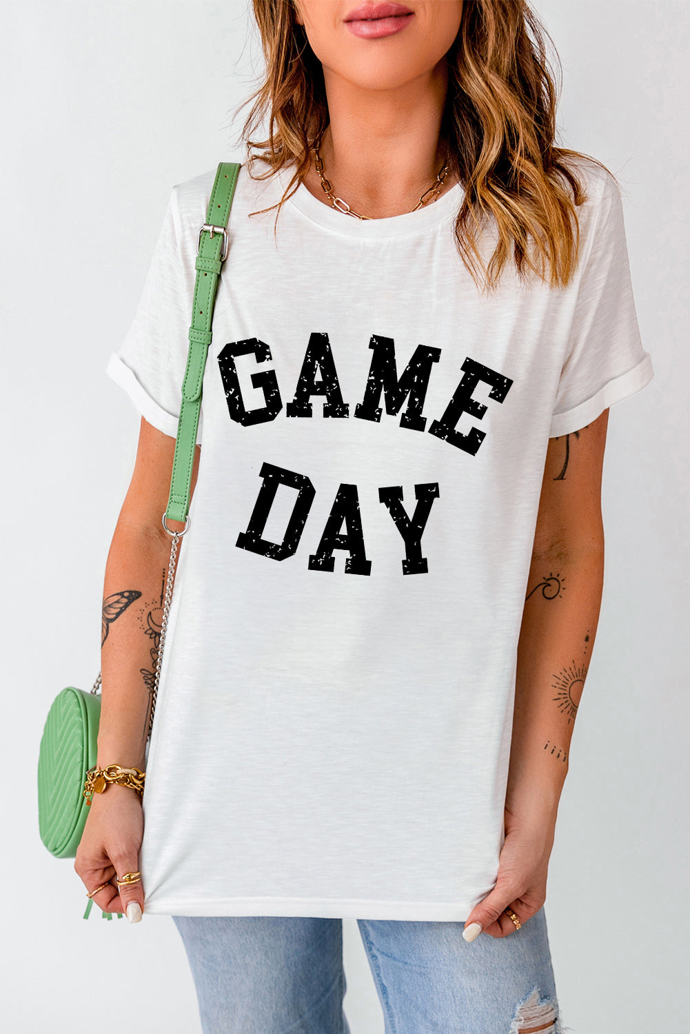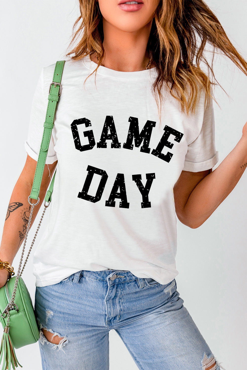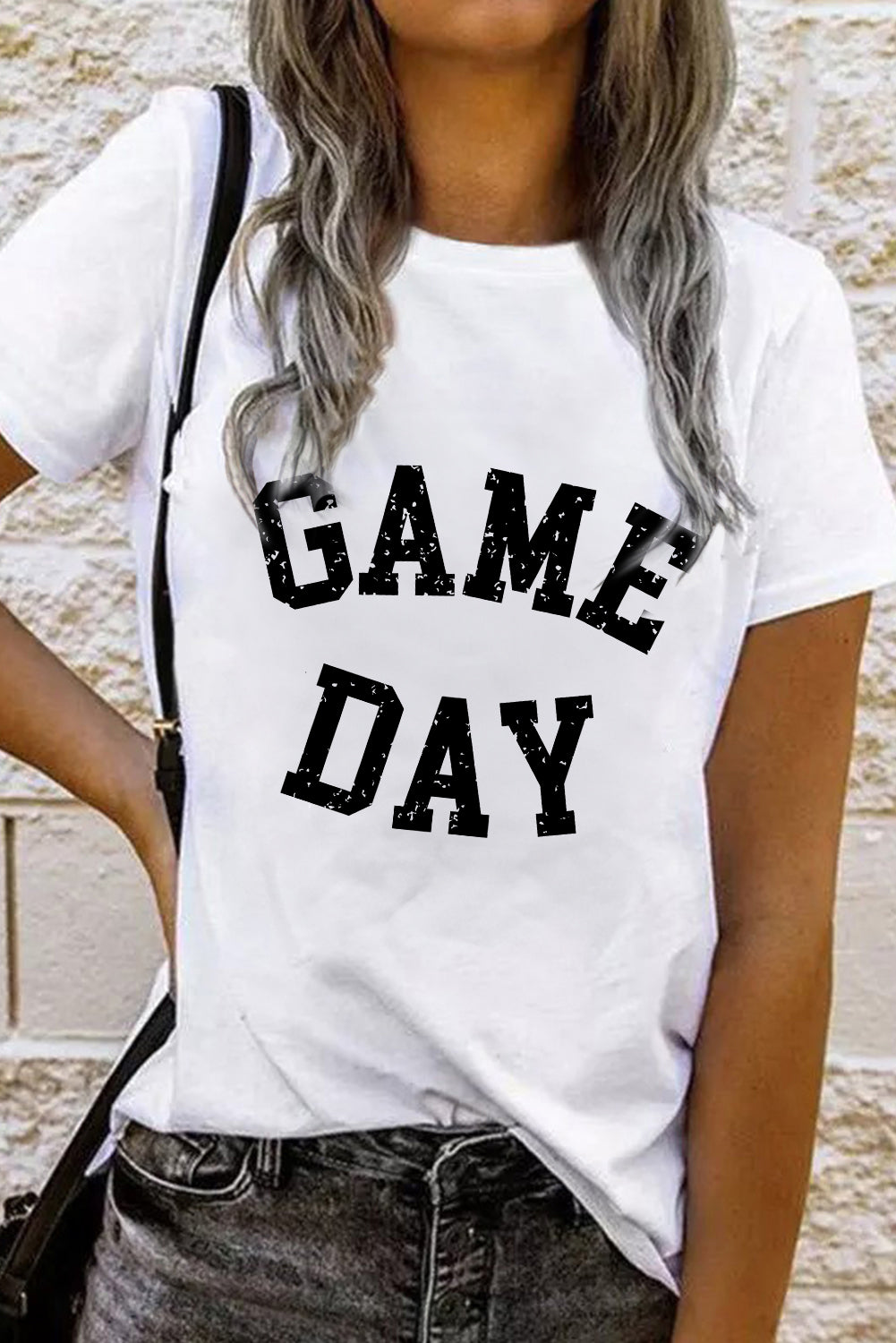 • White GAME DAY Graphic Crewneck T-Shirt is a versatile piece in a crisp white shade, perfect for daily wear or game days.